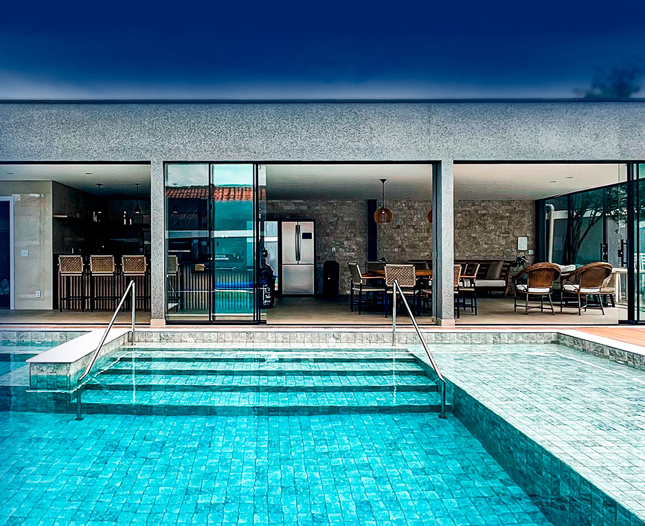 Segurança Técnica e Acabamento Premium. Da alvenaria robusta à instalação de equipamentos de ponta. Entregamos sua obra completa, com tecnologia de filtragem e aquecimento dimensionados para durar.